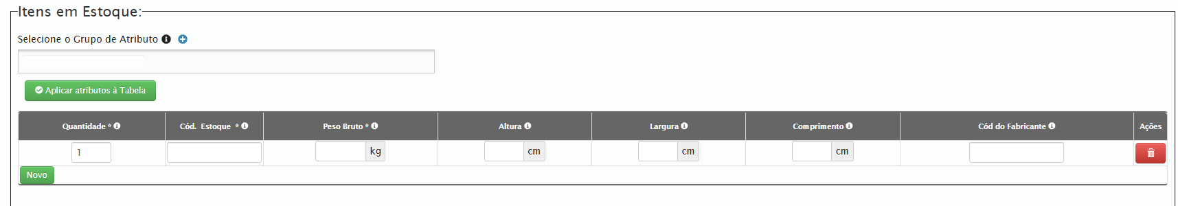 Na tela de cadastro de Itens em estoque temos os campos: