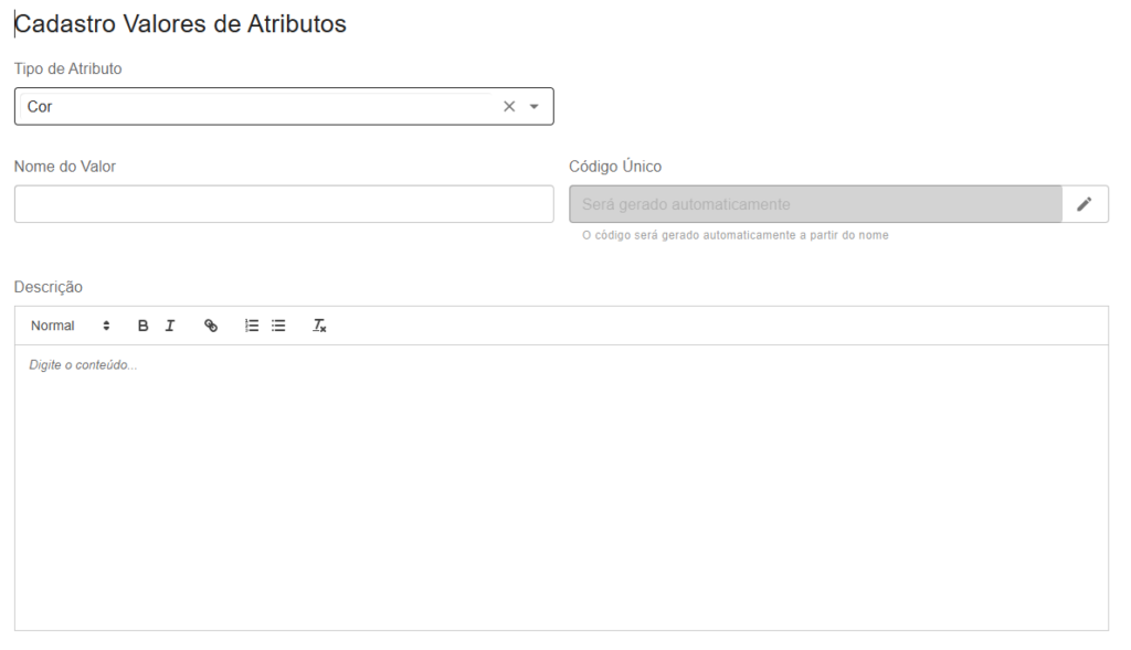 - Código único: Ele será criado conforme o preenchimento do nome do tipo de atributo.