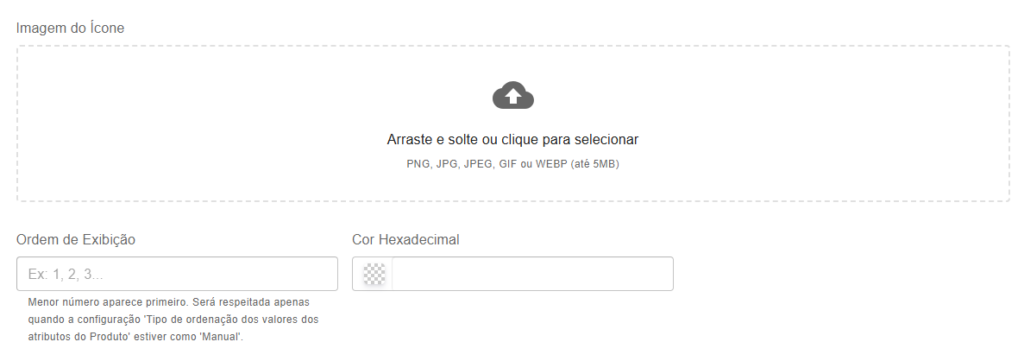 - Imagem do Ícone: Aqui você poderá acrescentar uma imagem, com a cor do ícone, normalmente usado em cores. Ele irá aparecer na página do produto quando tiver o atributo no produto.