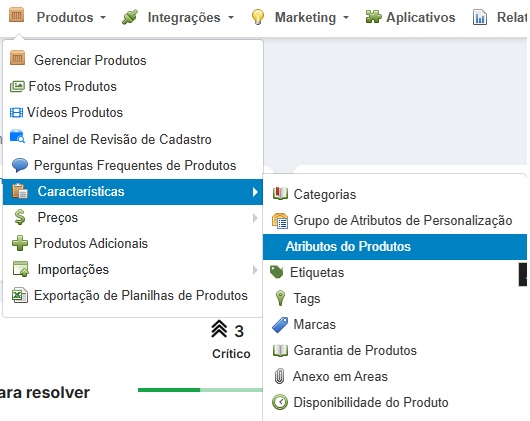 1 – Acesse o menu Produtos > Características > Atributos do Produtos: