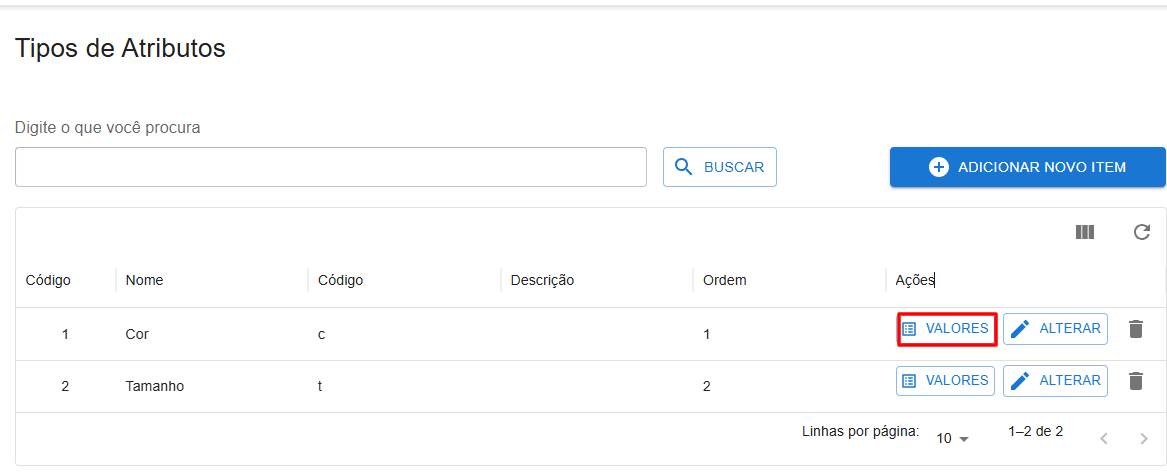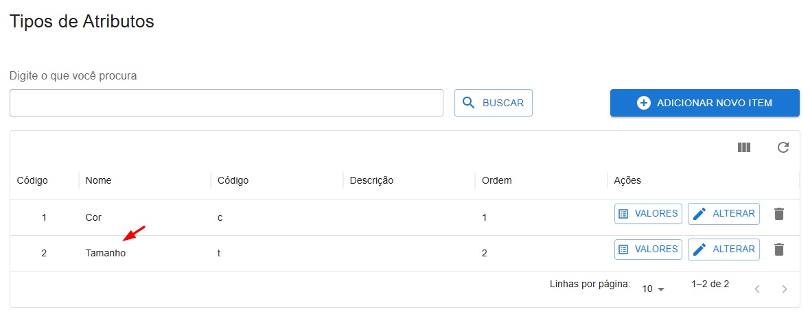 2 – Abrindo a tela, você deverá cadastrar um novo Tipo de Atributo chamado Tamanho, clique em adicionar novo item: