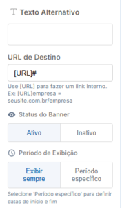6.2 – Texto alternativo do banner(nome do banner), URL de Destino(redirecionamento) Status(ativo ou inativo) e Formato de Exibição(Exibir sempre ou configurar período especifico para exibir):